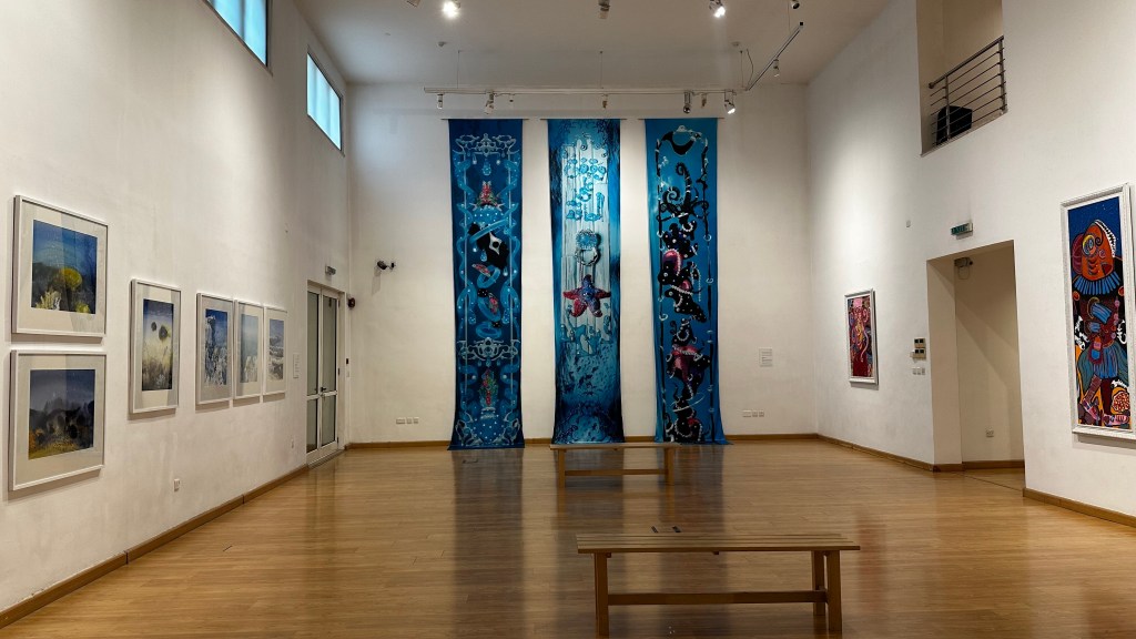أما تمارى العجلوني، فقدّمت أعمالًا تتسم بحس تصميمي، وحققت حضورًا بصريًا طاغيًا من خلال الأقمشة المطبوعة الكبيرة التي غمرت صالة العرض بدرجات الأزرق البحري. هذا الامتداد البصري خلق تجربة حسّية يصعب تجاوزها، رغم أن الأعمال من حيث المعالجة التشكيلية لم تطرح تحديات فنّية لافتة. إلا أن قوّتها تكمن في تأثيرها المكاني، حيث أسهمت في توليد طاقة بصرية واضحة، أضافت بعدًا للمعرض ككل. يمكن القول إن هذا الحضور، بما يحمل من كثافة وانسجام مع المساحة، ساهم في تعزيز تجربة الزائر، وقد تكامل بفعالية مع التنسيق الفني للمعرض، الذي أظهر حساسية واضحة في تقديم أعمال الفنانين الأحد عشر المشاركين.