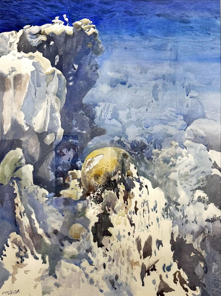 استخدم الألوان المائية بحرفية واضحة، وبشفافية وحساسية عالية في التباين بين درجات الداكنة والفاتحة، فأبرز الضوء الحقيقي تحت القاع.