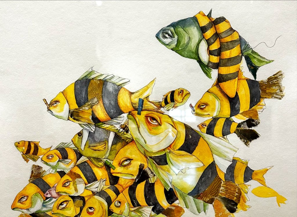 من بين المشاركات اللافتة، برزت سندس أبو العدس بحضور بصري طريف وتقنية عالية في الرسم والتصوير، حيث استطاعت أن تقود المتلقي في سرد بصري مسلّ ومتقن من خلال خمس لوحات ورقية مترابطة بالإضافة الى ثلاث اعمال اخرى. تبدأ السلسلة بصورة ذاتية (Self-Portrait) بأسلوبها الفني الخاص، تغوص فيها الفنانة في أفكارها ومخاوفها وجرابها المخطط بالأصفر والاسود، برفقة سمكة رمادية وحيدة وتعيسة بعض الشيء، لتنتقل بعدها إلى مشهد علّقت فيه الجوارب كتذكارات بشرية على حبال غسيل، لتبدأ السمكة ذاتها بسرقة الجورب في حبكة تصاعدية بصريًا ومفاهيميًا. في اللوحة الثالثة، تتنكر السمكة بالجورب محاطة بمجموعة من الأسماك المخططة، محاولة الانتماء إلى مجتمع غير مرحّب بها بدلالات واضحة وتعابير لا يمكن تجاهلها، قبل أن تعود الفنانة إلى تجربة شخصية أثناء الغوص، بلقاء سلحفاة في مشهدٍ فقدت فيه الجورب، ولكن اكتسبت مكافئات او ذكريات عديدة. وتُختتم السلسلة بعمل قوي بصريًا بعنوان “مرج عيون”، تكثيف لذكريات وتجارب بصرية متراكمة في تكوين لوني غني.